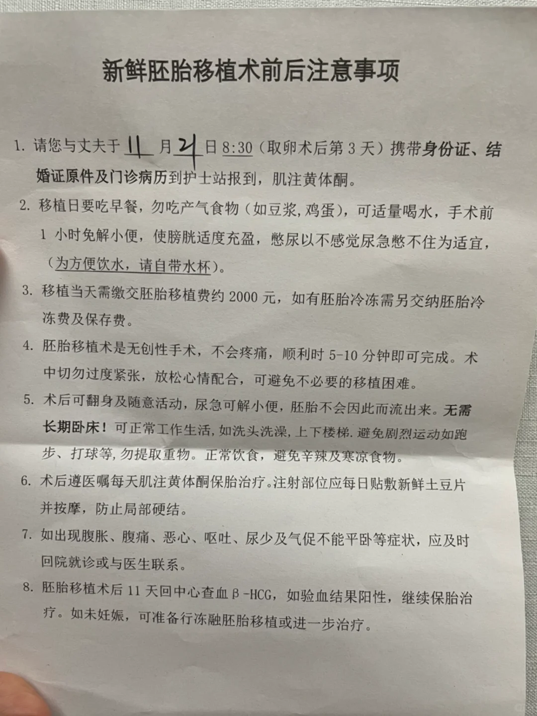 1取卵术后第3天携带身份证、结婚证原件及门诊病历到护士站报到,肌注黄体酮。2 移植日 要吃早餐,勿吃产气食物(如豆浆,鸡蛋),可适量喝水,手术前1 小时免解小便,使膀胱适度充盈,憋尿以不感觉尿急憋不佳为适宜,(为方便饮水,请自带水杯)。3 移植当天需缴交胚胎移植费约 2000 元,如有胚胎冷冻需另交...