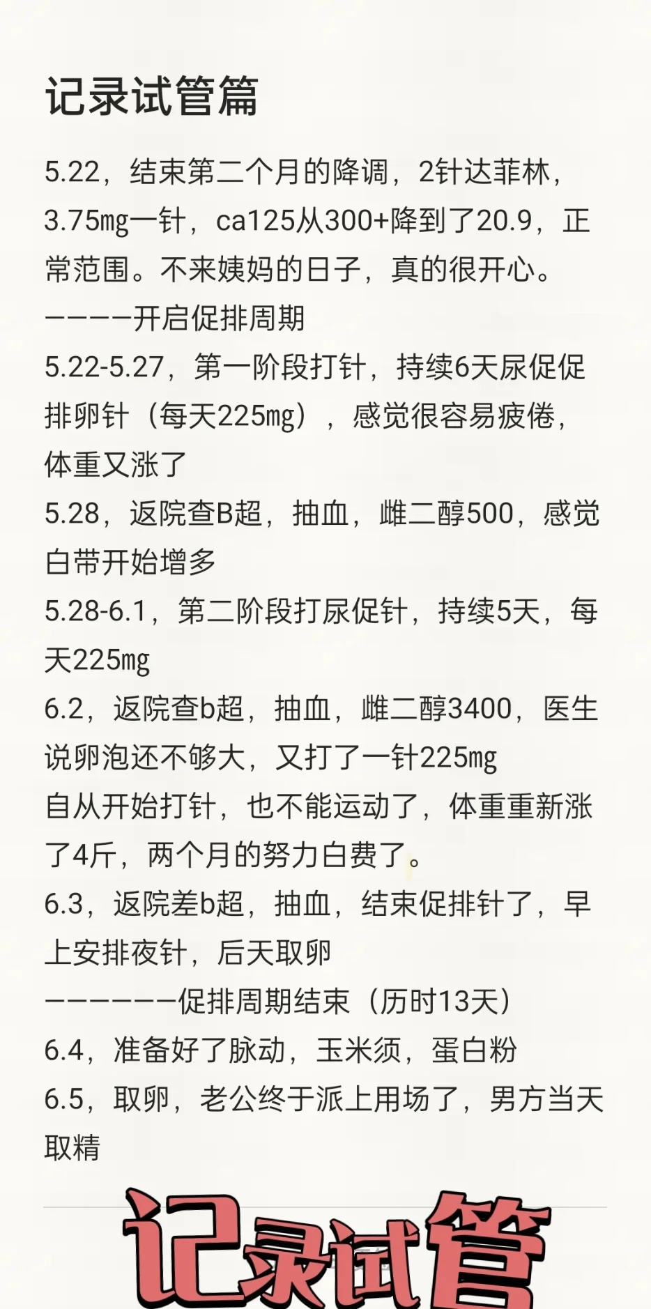 5.22,结束第二个月的降调,2针达菲林,3.75㎎一针,ca125从300+降到了20.9,正常范围。不来姨妈的日子,真的很开心。————开启促排周期5.22-5.27,第一阶段打针,持续6天尿促促排卵针(每天225㎎),感觉很容易疲倦,体重又涨了5.28,返院查B超,抽血,雌二醇500,感觉白带...